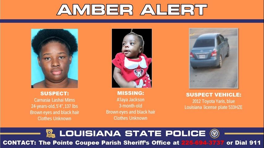 Carnasia Mims is accused of abducting 3-month-old A’laya Jackson. The child was last seen at 3:18 p.m on Bayou Run Drive in New Roads.