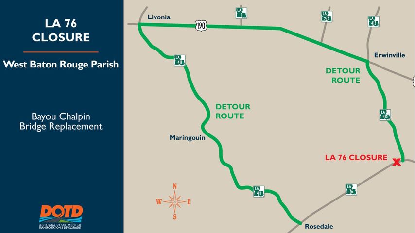 Motorists traveling eastbound on La. 76 will be detoured by turning left onto La. 411 (Sidney Road), continuing along La. 411, then turning right onto U.S. 190 eastbound. From U.S. 190, motorists will turn right onto La. 413 and continue south to reconnect with La. 76.