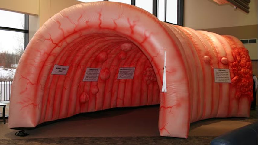 The inflated model shows what the colon looks like from the inside, including what a polyp and cancer look like. The interactive experience is a great way to provide education about screening as well as what symptoms are most common with colorectal cancer.