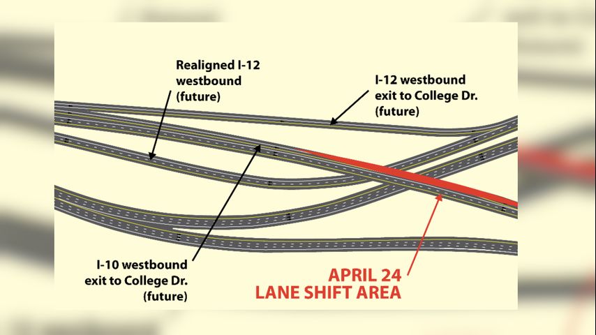 Starting at 5 a.m. Wednesday, traffic will be shifted to the right starting at the I-12 eastbound exit. Construction crews will clearly mark all shifts with barricades and temporary road markings overnight on the night before.