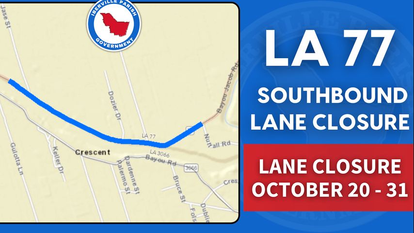 The closure, which will see one southbound lane of La. 77, also known as Bayou Jacob Road, be closed from Nuttall Road to approximately 300 feet past Jase Street. The closure is being done to allow crews to perform beam repairs between Bayou Plaquemine and La. 77.