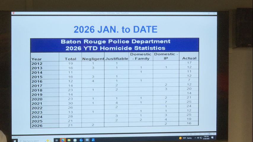 So far, there have been a total of 21 homicides in Baton Rouge since the start of 2026, according to data shown by the Baton Rouge Police Department. That is the same amount as 2025 up to this point, and seven less than 2024. Additionally, two of the homicides in 2026 were considered negligent homicides, and another two were considered Domestic Intimate Partner (I-P). The data also says the actual homicide number is 16 for up to this point in 2026.