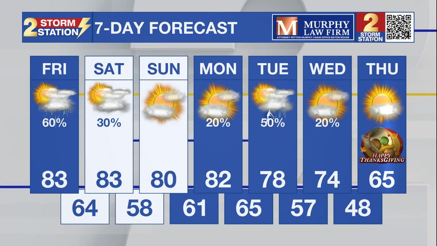 Up Next: The warm pattern continues through the weekend as a weak ridge builds overhead on Saturday. For Saturday’s LSU Game, very warm, temps in the upper 70s to low 80s during tailgating. Perhaps a spotty thundershower. Mild and humid during the game with temps falling into the upper 60s. Fog may redevelop late Saturday night into Sunday morning.