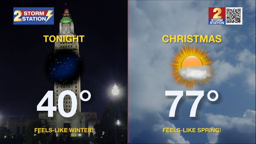 Tonight & Tomorrow: Take a jacket if you’re heading out for some Christmas cheer tonight, but this might be the last time you need it before the holiday. While we’ll have some chilly lows dropping into the upper 30s and low 40s early Saturday morning, a freeze is not expected. As we head into Saturday, winds will shift back to the south, quickly dragging warm, humid air from the Gulf. Expect a beautiful start to the weekend with plenty of sunshine and highs bouncing right back into the low 70s.
