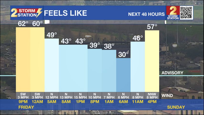 Tonight & Tomorrow: Generally light, intermittent rain will continue during the overnight hours as a cold front moves through the Baton Rouge area from north to south. As the front passes, winds will become northerly at 10-15mph and temperatures will tumble from the low 60s to the upper 40s. In fact, the high temperature for Saturday will likely occur before dawn. With that cold front through, overcast skies combined with northerly winds of 10-15 mph and falling temperatures will create a very chilly day. Wind chills during daytime hours could feel up to 10° cooler than the thermometer reads. Bundle up if you are headed out to Alex Box Stadium for the second game of opening weekend or if you have any outdoor activities planned. Feels-like temperatures will be in the upper 30s and low 40s during the daylight hours.