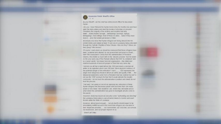 "I am going on record as opposing any relocation of these Syrian refugees into Ascension parish until such time that I am made aware of who these 'new residents' are, where they will reside and to what extent this administration has gone to investigate all who come to this parish," he wrote in the post. Wiley argued that more should be done to inform local agencies, such as sheriffs, about any relocation operations.