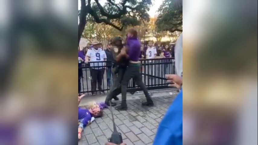Video posted to social media Saturday morning shows the unidentified man swinging at and fighting off a sheriff's deputy who was trying to stop a violent brawl going on just outside the stadium, near Mike the Tiger's habitat.