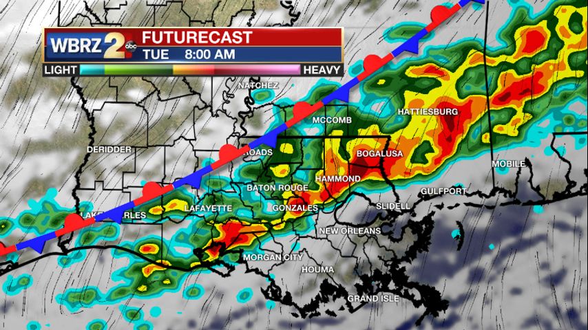 Up Next: The rest of the showers and storms will work through south Louisiana on Tuesday morning. Showers are expected to be widespread before 9 am. Expect the morning commute to be moving shower than normal. By noon on Tuesday, we will be drying out and drier air will move in behind the rain. Temperatures on Tuesday will be capped in the low 70s. Wednesday morning will start with temperatures in the low 50s. Wednesday afternoon will be mostly sunny with high temperatures in the low 70s. Thursday is trending a little warmer with highs closer to 80°. Starting Friday, the humidity will be climbing and temperatures will be in the mid to upper 80s. A few showers will be possible in the late evening. Scattered showers will then move in early Saturday. The entire day will not be a washout, but it will be humid. Warm temperatures in the 80s last into Sunday too. Click here to see the 7-day forecast.