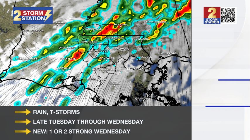 Expect a mixture of clouds of sun for the rest of the day. Look for a high near 83° in Baton Rouge – easily challenging the record of 81° (2024, 2017, 1999). A persistent south wind behind the warm front could lead to spotty showers as things heat up. By late afternoon, an axis of thunderstorms will form along the warm front. But by this time, the front will likely be north of Baton Rouge. Areas along and north I-10/12 have the potential of being clipped by these storms anywhere from late Tuesday afternoon through the evening. Spots closer to the coast will have a harder time picking up rain.