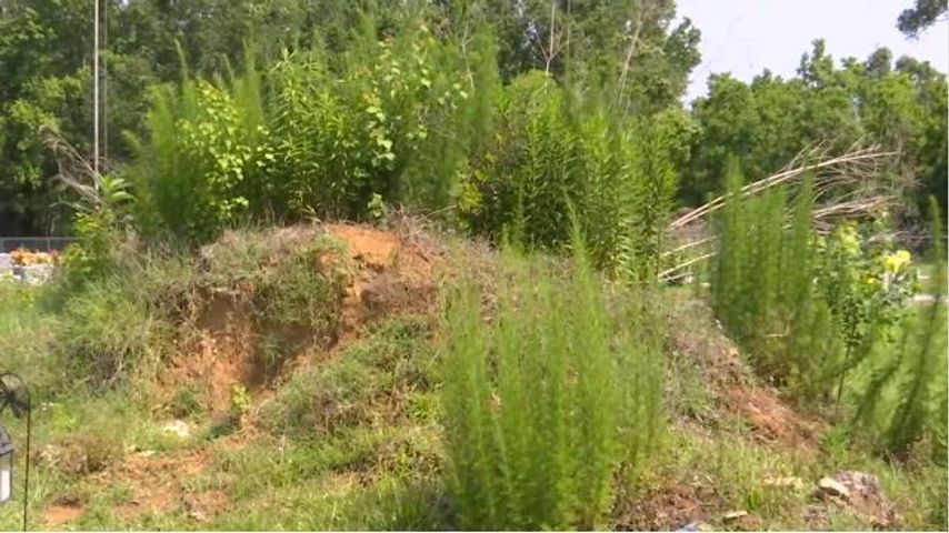 The dirt pile has tall weeds and trees growing out of it. Watts can't believe it's in a cemetery and thinks it's been long enough. She contacted the cemetery caretakers when she first saw the issue in 2020. Then, she was told it would be moved when the pile dried.