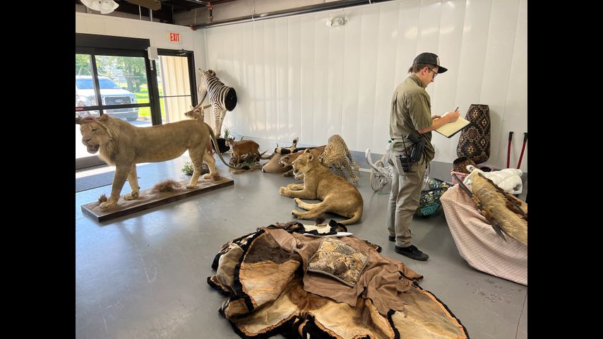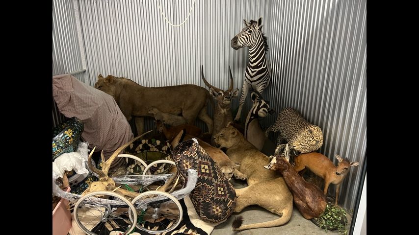 Also photographed among the recovered property was collection of stuffed and mounted animals, including a zebra and multiple lions.