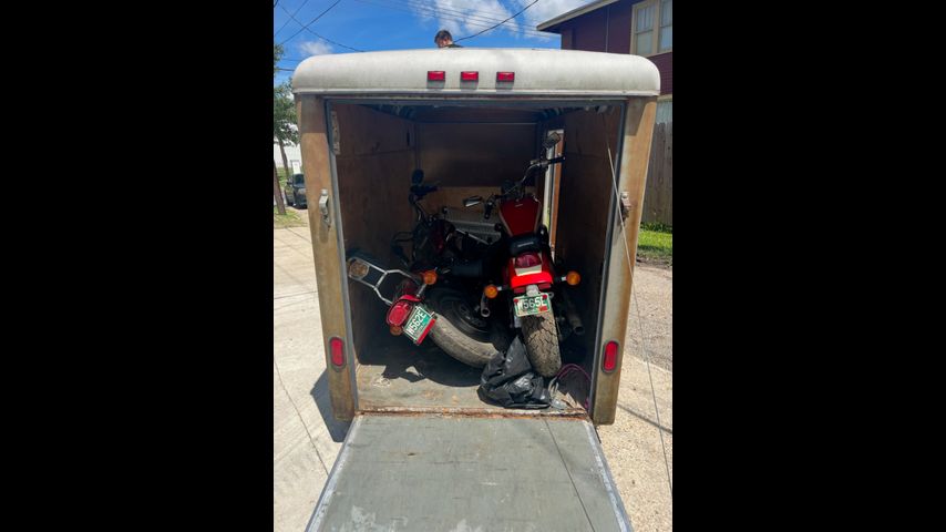 Officers recovered multiple vehicles, trailers and other missing items at the Baton Rouge home Wednesday. Photos taken at the scene of the raid showed a stolen SUV and a trailer loaded with two motorcycles.
