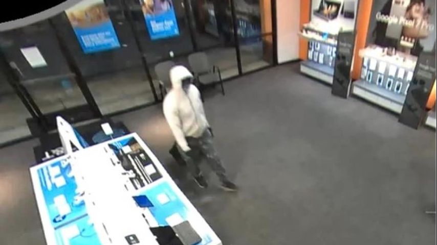 Police say the unidentified male suspect entered the business with a rolling suitcase before pointing a gun at an employee, demanding they fill the suitcase with cell phones.