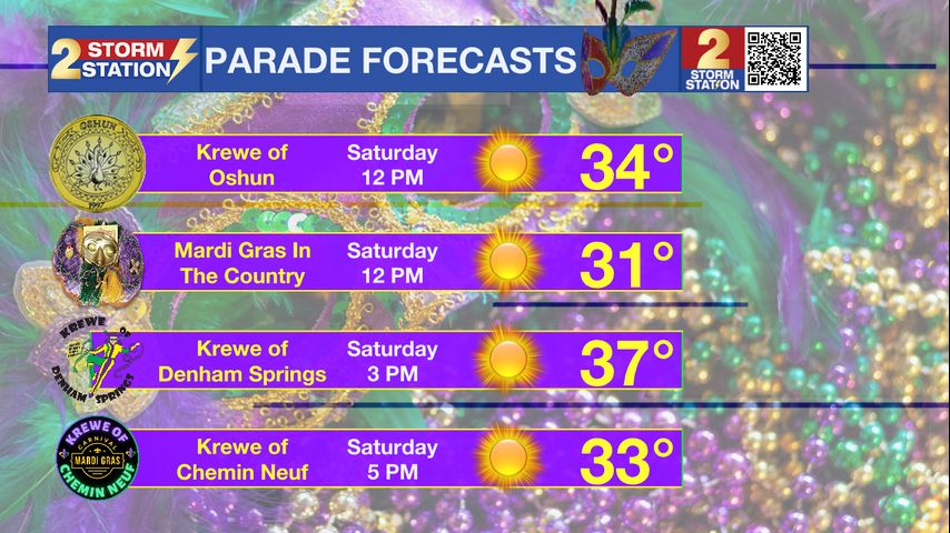 Today & Tonight: Despite a mostly sunny sky, temperatures won't stay above freezing for long on Saturday. Look for a high in the mid-to-upper 30s around mid-afternoon. Meanwhile, a north wind at 10-20 mph and gusts to 30 mph will keep wind chills in the 20s. With several Mardi Gras parades in the Capital Area, anyone heading out should bundle up with multiple layers, a hat, and gloves — and a warm drink won’t hurt.