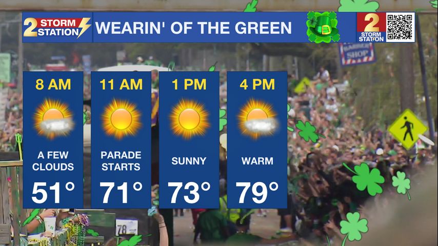 Conditions will be especially nice for the Wearin’ of the Green Parade. Expect sunshine mixed with a few clouds with temperatures rising from the mid-70s to near 80. Winds will be light to moderate out of the southeast, and no rain is expected during the parade.