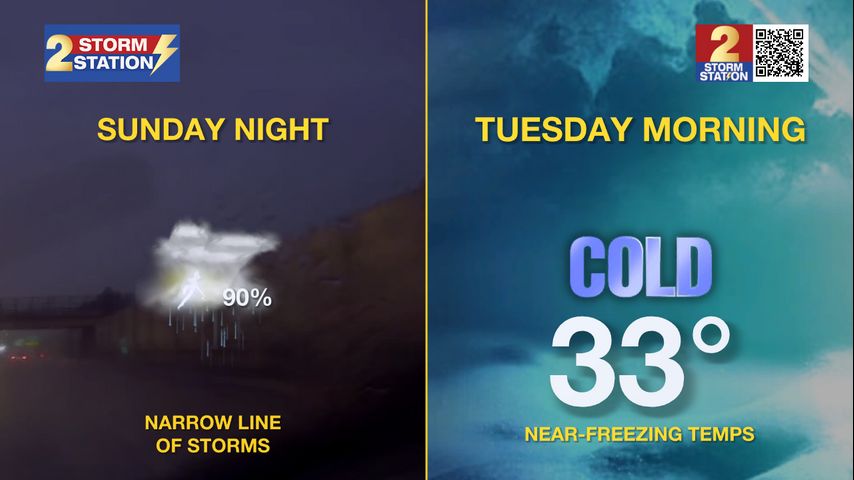 A cold front rolling through Sunday night will bring a line of showers and storms. After it passes, temperatures will quickly drop, with some even seeing freezing conditions early next week.