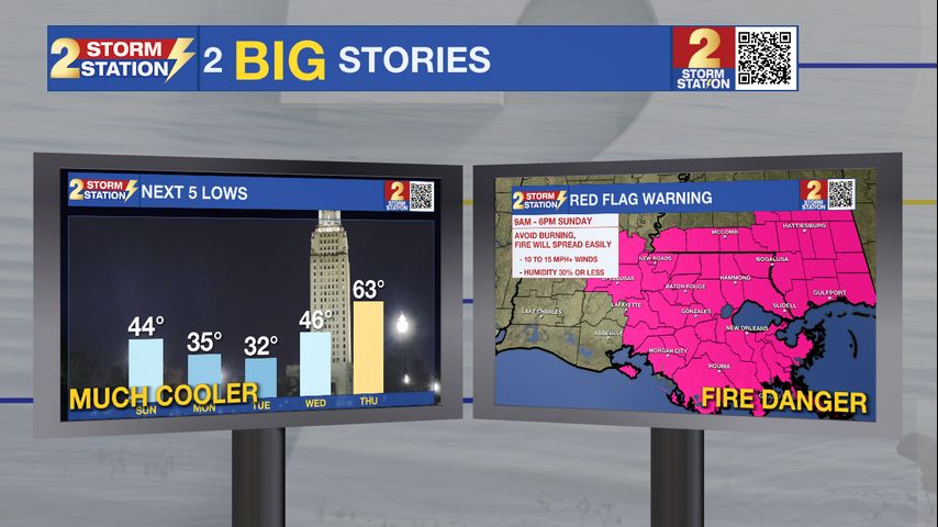 A ***RED FLAG WARNING*** has been issued from 9am-6pm on Sunday. North winds 15 to 25 mph with gusts up to 35 mph combined with very low relative humidity will cause a fire risk. Any fire that develops will catch and spread quickly. Outdoor burning is not recommended.