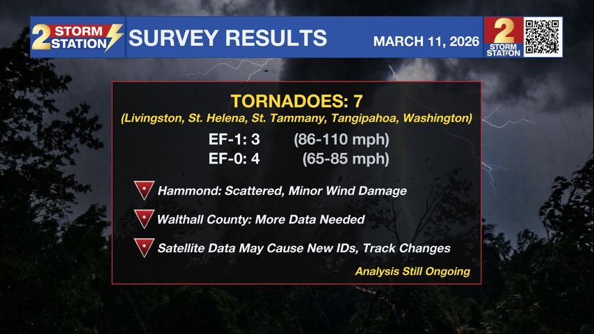 The National Weather Service (NWS) has released its preliminary damage survey results following the line of severe thunderstorms that raced through the region on Wednesday night (March 11). Crews confirmed that at least seven tornadoes touched down across five Louisiana parishes, leaving a trail of snapped trees and minor structural damage.