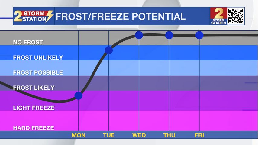 Up Next: After the cold start Monday morning, mainly clear skies will send temperatures higher and higher each day. Monday afternoon will be in the 60s, Tuesday in the 70s and Wednesday in the 80s. Clouds will increase on Thursday. Although there will be clouds, rain looks unlikely at this point. A cold front will move through early Friday morning. This will bring cooler temperatures and dry conditions for the start of next weekend.