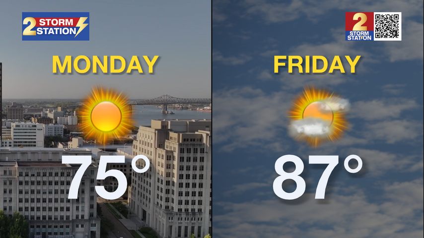 Sunshine prevails on Monday, with daytime highs reaching more comfortable levels. Look for a high near 75° in Baton Rouge, which runs about 5° below average for this time of year. The humidity will not be an issue.
