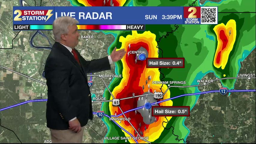Tonight and Tomorrow: A large complex of thunderstorms moved through the area late this afternoon bringing heavy rain, dangerous lightning, gusty winds to 40 mph and dime size hail causing yet another delay to the Baton Rouge NCAA Regional baseball tournament. Those storms have not moved southwest of the area and there appears to be no immediate development behind these storms. Expect cloudy skies to rule the forecast for the evening and overnight hours with conditions remaining dry and temperatures falling to around 70 degrees. Monday calls for a repeat performance of isolated thunderstorms that could develop much earlier in the day and just after the noon hour. A 60% chance of rain exists for the day on Monday with the threats being the same as mentioned above with this afternoon's storms.