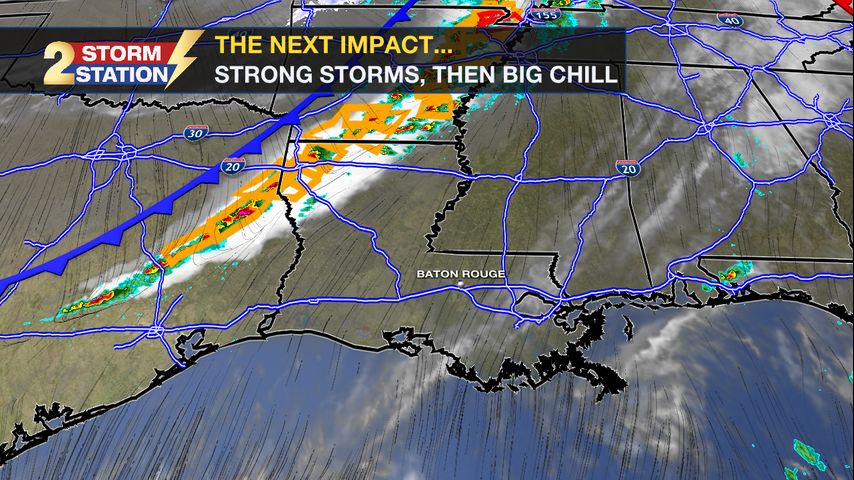 A strong cold front is about to kick the warm, spring-like feel out of the area. After a thin line of thunderstorms sweeps through late Sunday, a brisk northwest wind will usher in a significant cooldown for the Gulf Coast.
