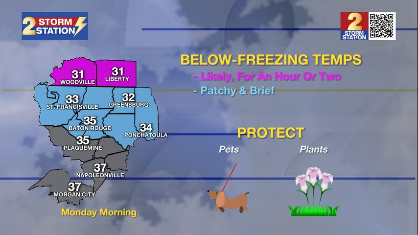 Tonight & Tomorrow: A strong push of cooler and drier air has made its presence known. By Monday morning, some areas could experience a light freeze. This would primarily be for areas in southwest Mississippi where temperatures could dip below 32° for an hour or two. Lows might manage to hit freezing in a few neighborhoods as far south as the I-10/12 corridor, but that would be brief. In Baton Rouge, look for a low near 35°. The cold temperatures could damage or kill sensitive vegetation, especially if plants have begun to leaf out and bloom. For areas north of the interstate, it's not a bad idea to protect pets and plants. After the cold start, a sunny sky will push highs into the low-60s on Monday afternoon - about 5° below average. It will not be nearly as breezy; expect an east wind at 5-10 mph.