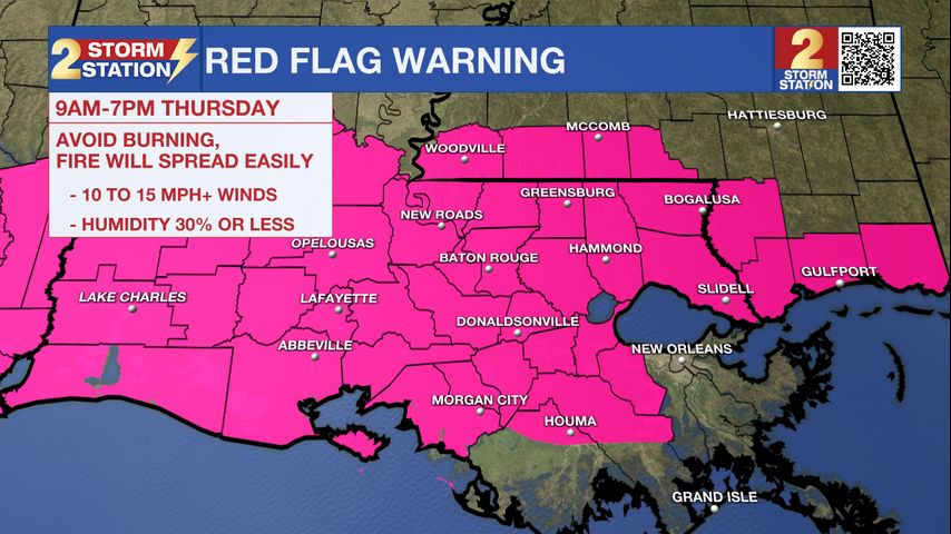 A RED FLAG WARNING is in effect Thursday from 9 AM to 7 PM for southeast Louisiana and southern Mississippi. Strong winds of 15-25 mph with gusts up to 30 mph and low humidity, as low as 20%, will create dangerous fire conditions. Fires can start and spread quickly. Avoid outdoor burning—it’s not safe! Be extra cautious with anything that could spark a fire. Stay alert and help prevent wildfires!
