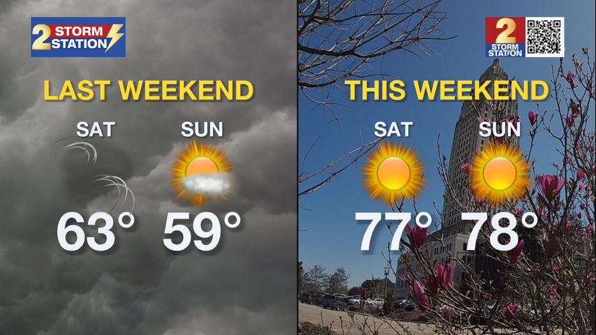 Up Next: The weekend forecast still looks phenomenal. Skies will be dominated by sunshine, highs increase to the upper-70s, and the wind backs off a touch more. If you have plans to head out to Alex Box stadium, don’t let the weather stop you.