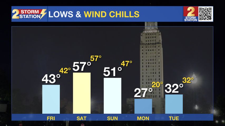 Up Next: The two weekend days will be jarringly different. Saturday is the pick for outdoor plans with highs about 10 degrees above average in the low 70s. There is a slight, 10% chance of a shower, but most of us will stay dry. A very potent cold front is slated to sweep through on Sunday morning. This strong front will bring isolated showers before dawn. The real impact will be the temperature drop as highs remain in the 50s into the afternoon, whereas overnight lows will plummet into the middle and upper 20s. A few might be looking at a brief hard freeze, so stay in touch with the forecast through the weekend or even consider wrapping any pipes as a precaution. Know that north winds should be strong enough to create a wind chill, or feels-like temperature, that is colder to people than what thermometers show.