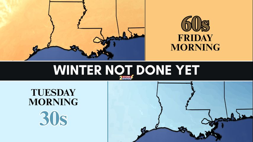 By Monday and Tuesday morning, expect our coldest temperatures in a while. Highs on Monday will struggle to reach 60 degrees, and then a light freeze is possible for many areas overnight, especially along and north of the I-10/I-12 corridor. Because of our recent warm spell, many plants have already started to "green up" and come out of dormancy. These tender buds are very sensitive to freezing temperatures, so you'll want to cover them or bring them inside by Sunday night!