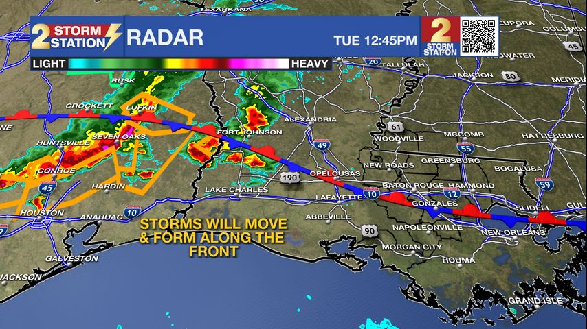 UPDATE - 1 p.m. Tuesday: The Storm Station is keeping a close eye on a cluster of thunderstorms near the Texas-Louisiana state line. These storms will continue to move along a stationary front that is straddling southern Louisiana, plus additional storms may develop along it. This front is separating extremely humid air near the coast from less humid air to the north.