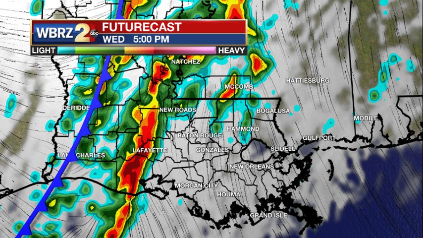 Up Next: On Wednesday the humidity will keep building up and temperatures will be near 80°. By Wednesday evening showers will become widespread across south Louisiana. There is a level 2/5 SLIGHT risk for high winds and spin up tornadoes. You may be issued a severe thunderstorm warning if high winds are detected. Storms will clear from west to east overnight and we will be dry before sunrise on Thursday. Rainfall totals will be 1-2+ inches. Isolated higher amounts may briefly overwhelm the drains. Look out for those typical problem spots while it is actively raining. That will be late, from 7-10pm.