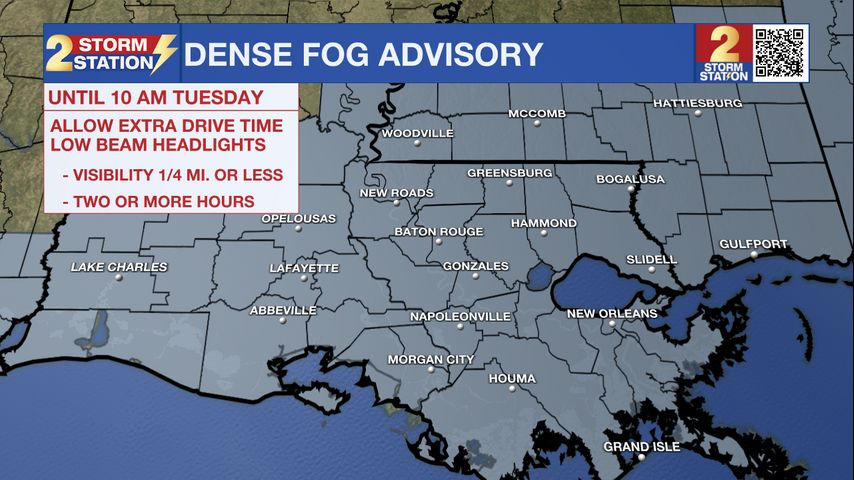 A *DENSE FOG ADVISORY* is in effect from 3am - 10am Tuesday across southeast Louisiana and southwest Mississippi. Visibility may be one quarter mile or less in dense fog and could make driving conditions hazardous, especially during the Tuesday morning commute.