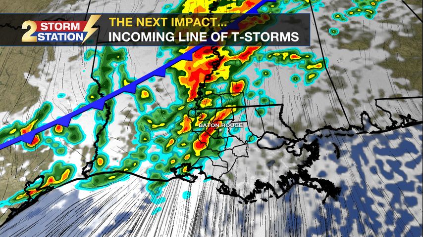 The Next Impact: On Wednesday evening, a line of thunderstorms will roll through the Capital Region, likely arriving after dark. The line could push into Pointe Coupee and Iberville Parishes as early as 6 to 7 p.m., likely reaching Metro Baton Rouge in the 8 p.m. to midnight timeframe. Most of the action will clear the I-55 by 1 to 2 a.m. at the latest. Widespread rain is expected, with totals ranging from 1–2" in many neighborhoods. Fortunately, the quick-moving nature of these storms should limit flash flood concerns this time around; however, stay alert for brief, poor-drainage flooding in areas caught under the heaviest downpours