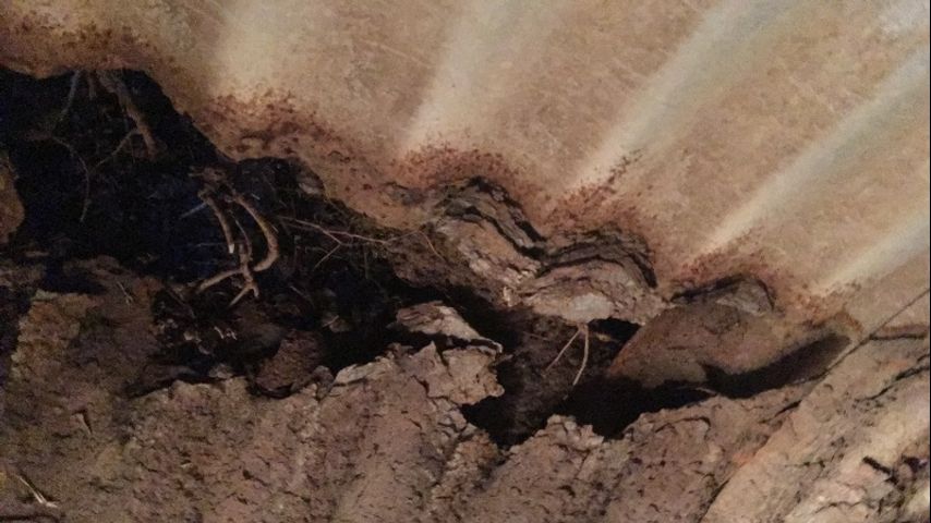 Large grates cover an opening leading to the pipe through Landry's backyard. Photos taken from inside the pipe show how the metal has eroded and in many places is nonexistent.