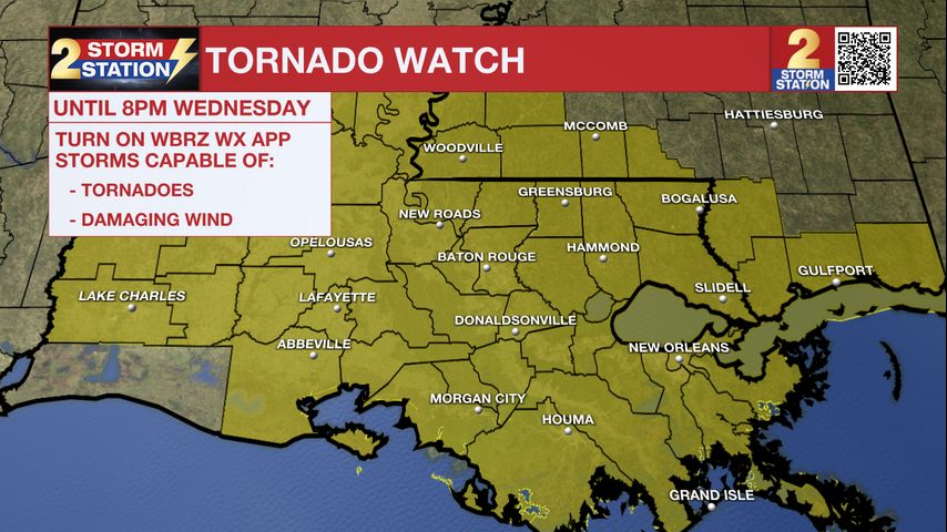 A *TORNADO WATCH* remain in effect for East Baton Rouge, West Baton Rouge, Ascension, Assumption, Iberville, East Feliciana, Livingston, Pointe Coupee, St. Helena, St. James, St. Mary, Tangipahoa, and West Feliciana Parishes, as well as Amite and Wilkinson Counties until 8 p.m. Wednesday.