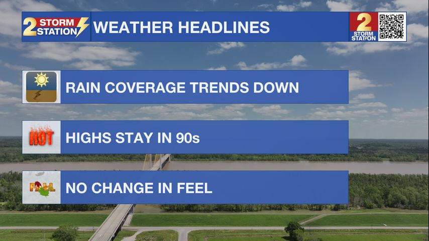 Rest of the Week: High pressure will build through the end of the week, bringing down rain coverage to around 10%. Highs will stay in the 90s with humidity noticeable, but once again not to summertime extremes. Lows will bottom out in the upper 60s.