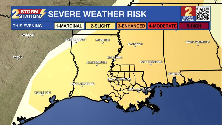 The Next Impact: The forecast has gone to expectation so far this afternoon, and everything is still on track for this evening. Around 2-4 pm, isolated to scattered showers and a few storms will begin to form. Any severe threat will be very low with this round. The best chance of rain and severe weather will occur with a line of storms. Latest guidance has continued to speed up, and now have this line near Baton Rouge around 7-8 pm. If you live to the west, arrival time will be about an hour earlier, and to the east, an hour later. Everyone will get the rain, but not everyone will see severe weather.