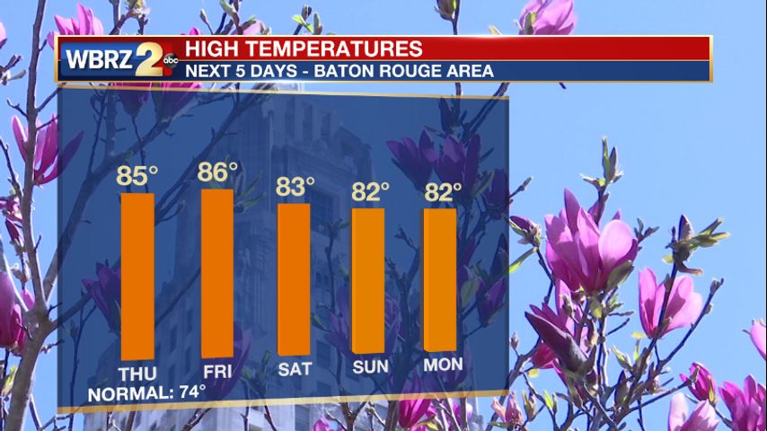 Up Next: High temperatures will be in the 80s on Thursday and Friday afternoon too. Overnight lows will climb into the 60s. Humidity will climb a bit, but significant rain stays out of the forecast until Friday evening. The next cold front will bring in scattered showers on Friday evening and will clear overnight into Saturday morning. There is some level of severe risk for the entire WBRZ viewing area on Friday. The risk gets higher the further north you live.
